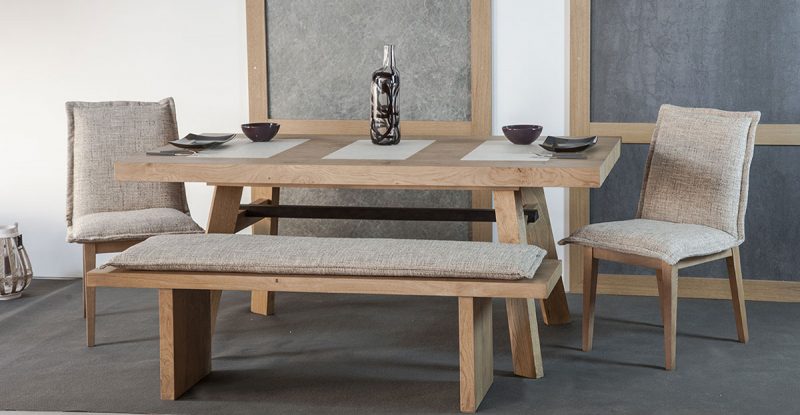 Τραπεζαρία ιδιαίτερης αισθητικής με αρμονικό συνδυασμό τριών υλικών. Ξύλο δρυς, λάκα και κεραμική επιφάνεια δημιουργούν ένα εξαιρετικό αποτέλεσμα. Η τραπεζαρία δέχεται προεκτάσεις και μπορεί να παραχθεί σε χρώματα και διαστάσεις επιλογής του πελάτη.